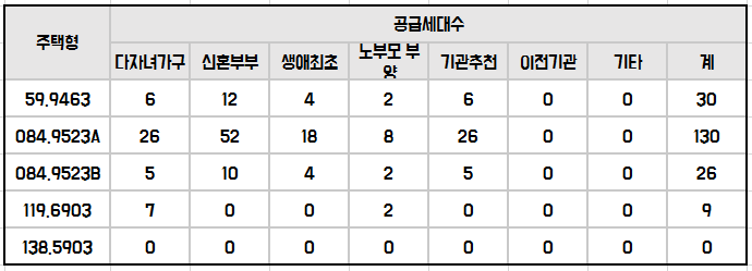가구수는 ▲ 59㎡ 59가구 ▲ 84㎡ A 259가구 ▲ 84㎡ B 54가구 ▲ 119㎡ 73가구▲138㎡ 4가구입니다.