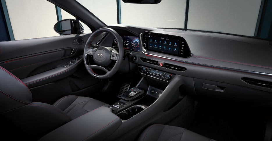 실내는 기존 쏘나타와 비슷한 구성이지만 보다 그립감을 강화한 N 라인 전용 스티어링 휠과 메탈 페달, 스웨이드 소재가 적용된 N 라인 전용 시트, 레드 스티치 등 차별화된 디테일이 적용됩니다.