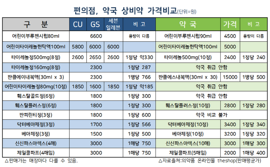 편의점과 약국 상비약은 같은 약이라도 성분과 용량이 다르기 때문에 가격이 차이가 납니다.