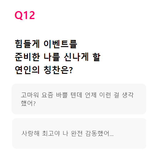 Q. 힘들게 이벤트를 준비한 나를 신나게 할 연인의 칭찬은?