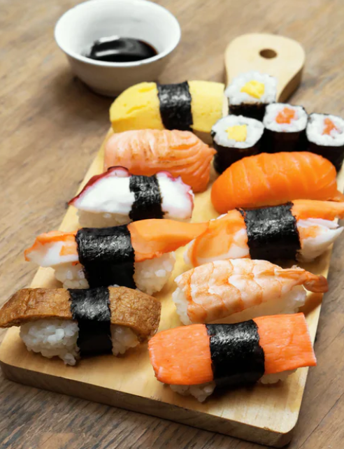 연어, 구운연어뱃살, 광어, 가자미지느러미, 참소라, 계란말이, 장어, 농어, 송어, 새우,생새우, 타코와사비, 제육볶음, 양념닭갈비, 화로산적, 참치마요, 소불고기, 호두멸치 등이 있으며, 가끔씩 김밥조각도 판매합니다. 최근에는 유부초밥이 추가되어 990원에 판매합니다.