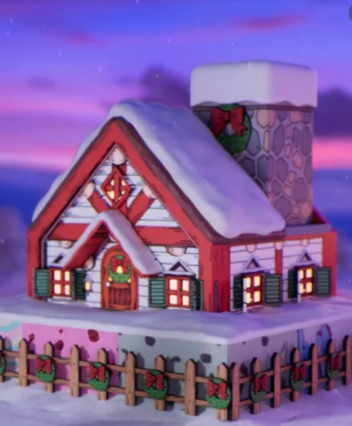 케이크 위에 눈이 덮힌 굴뚝 집 모양의