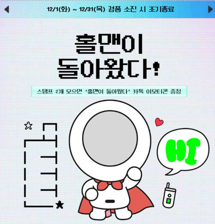 스탬프 2개를 모으면 홈맨이 돌아왔다! 카톡 이모티콘을 증정하는 행사를 합니다.