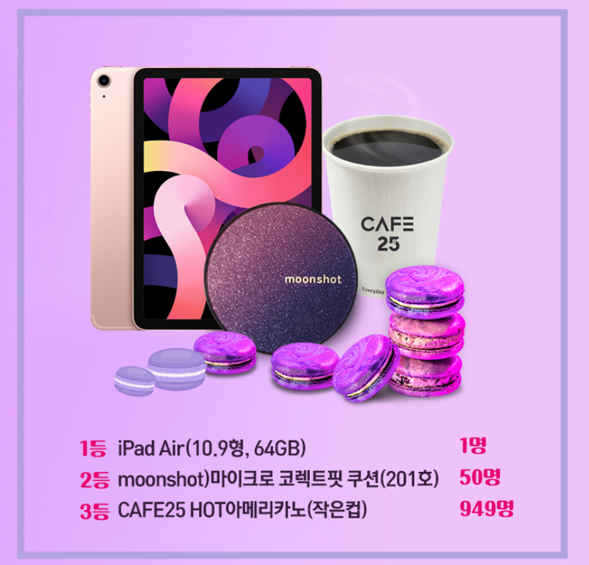 추첨을 통해 아이패드 에어 1명 , 마이크로 코렉트 핏 쿠션 50명, 아메리카노 949명 증정 행사를 합니다.