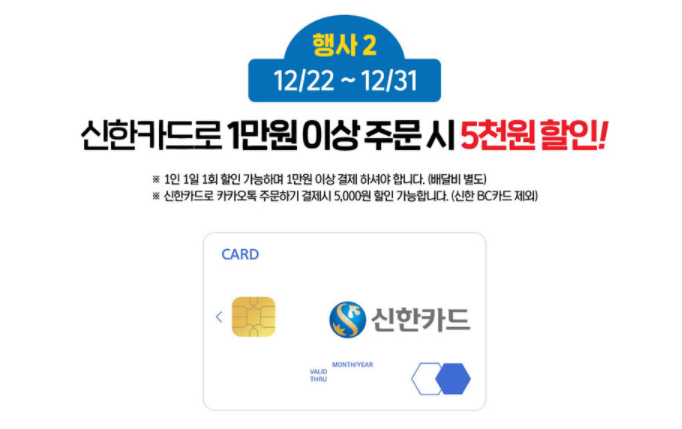 100원딜 릴레이뿐 아니라 신한카드로 1만 원 이상 주문 시 5000원 할인행사
