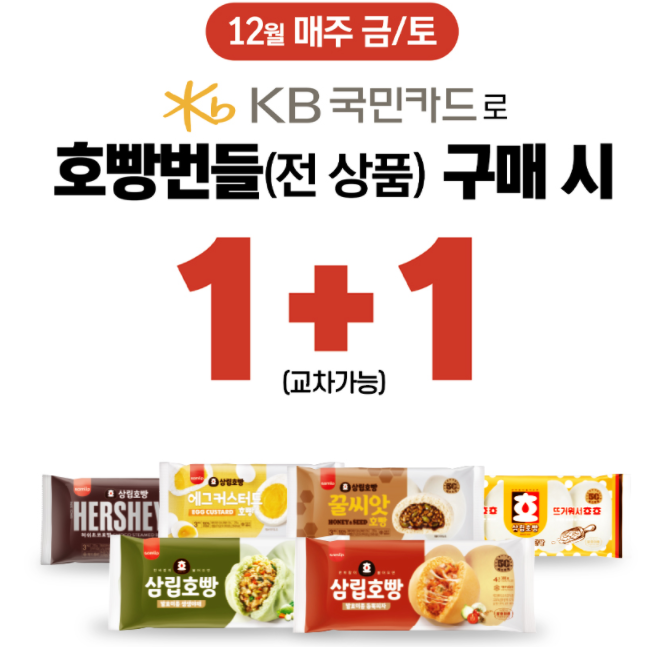 12월 한 달 매주 금요일, 토요일 국민카드로 호빵 (전상품) 번들 구매 시 1+1 증정되는 이벤트를 진행합니다.