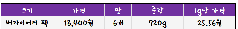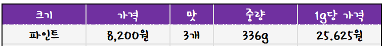 1g당 중량은 25원으로 파인트보단 싸지만 패밀리 이상의 사이즈가 22원대로 변경됨을 감안하면 아직도 비싼감이 있습니다. 친구들과 함께 한번에 나눠 먹기 좋은 크기 입니다.