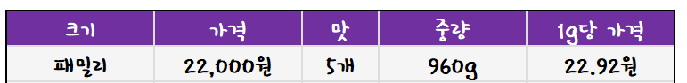 1g당 가격은 22.92원이며, 말그대로 패밀리 가족과 함께 냉장고에 넣고 즐길 수 있는 크기입니다.