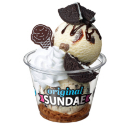 퐁당 쇼콜라 선데: 프랑스식 디저트 퐁당 쇼콜라를 모티브로 개발한 제품으로 초콜릿 케이크에 초코 시럽을 뿌린 후 쿠키 앤 크림 주니어 스쿱과 오레오, 슈가파우더를 얹어 줍니다.