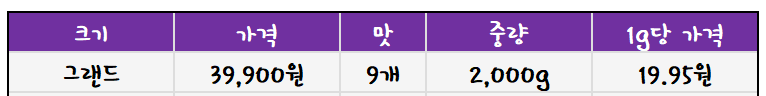중량도 2,000g으로 넉넉하며, 가장 경제적인 선택인 1g당 가격도 19,95원으로 가장 저렴합니다.