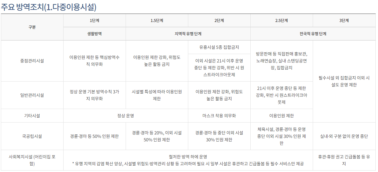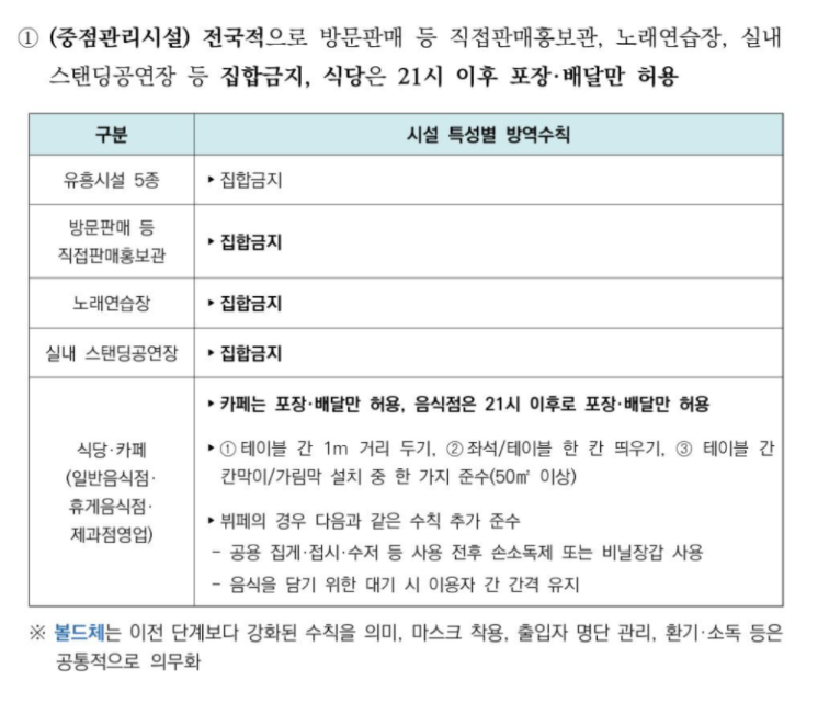 중점관리시설은 방문판매 등 직접 판매 홍보관, 노래연습장, 실내 스탠딩 공연장 등 집합이 금지되고, 식당은 21시 이후 포장과 배달만 허용이 됩니다.