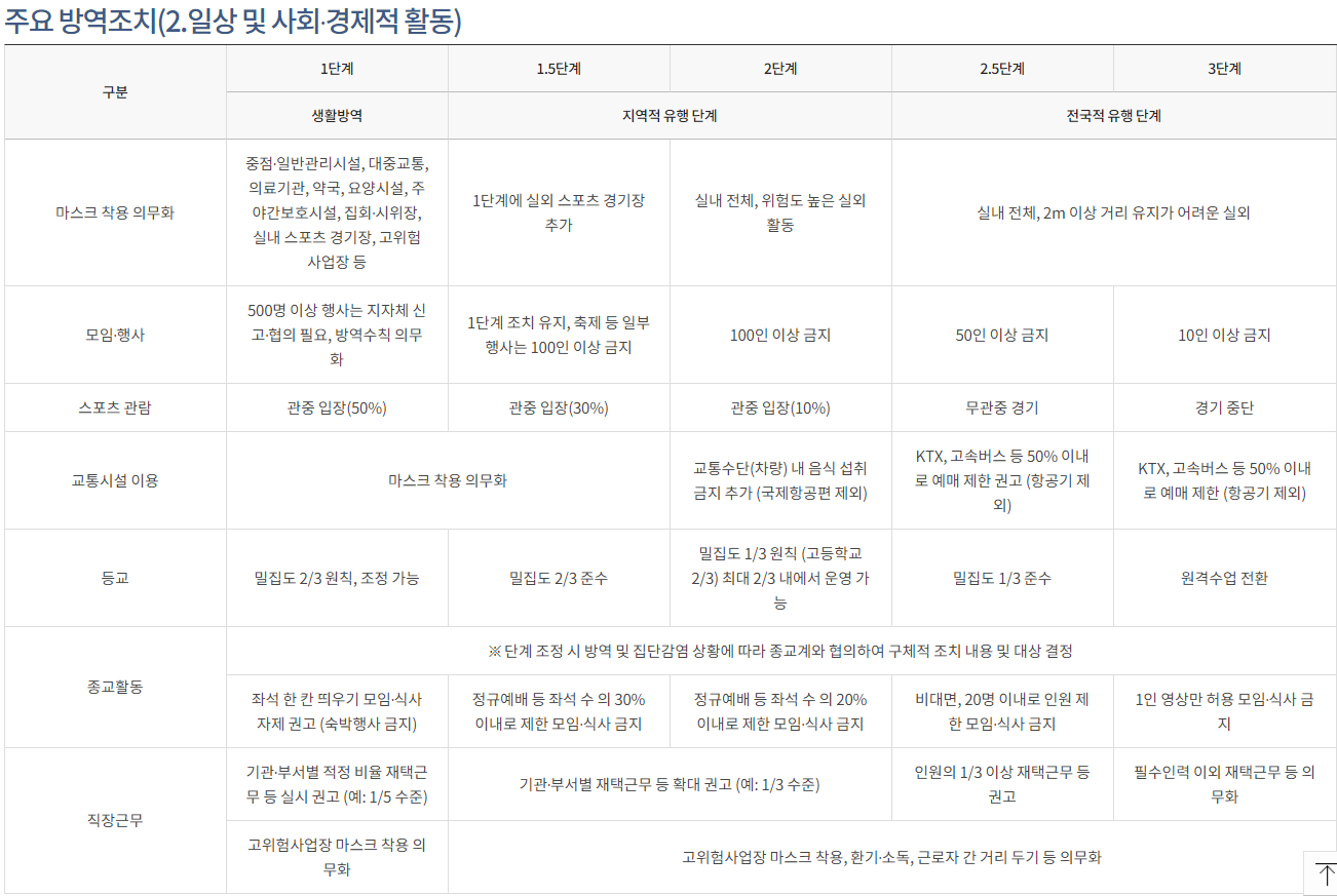 종교활동(교회, 성당 등)은 비대면 예배·법회·미사·시일식 등을 원칙으로 하며, 대면 모임의 경우에도 참여 인원을 20명 이내로 해야 합니다. 종교활동 주관의 모임·식사는 금지됩니다.