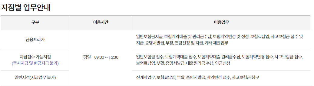 이용업무: 신계약업무, 보험료납입, 부활, 증명서발급, 계약변경 접수, 사고보험금 청구