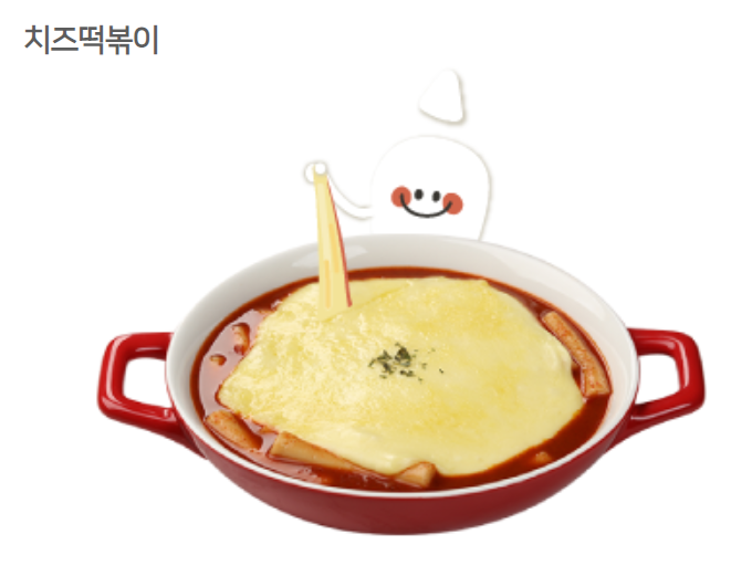위의 떡볶이에 치즈 올린 버전입니다. 치즈값이 천원 비주얼은 엽기떡볶이에 올라간 치즈를 그냥 떡볶이에 얹어놓은 것처럼 생겼습니다. 치즈를 올려서 먹어도 여전히 맵습니다.