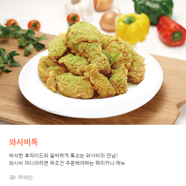 여러 체인 업체에서 치킨메뉴는 국내산 생닭을 사용하지만, 순살은 브라질산을 사용하는 경우가 많은데, 페리카나는 순살 모두 국내산을 사용합니다. 역시! 믿고 먹는 페리카나!