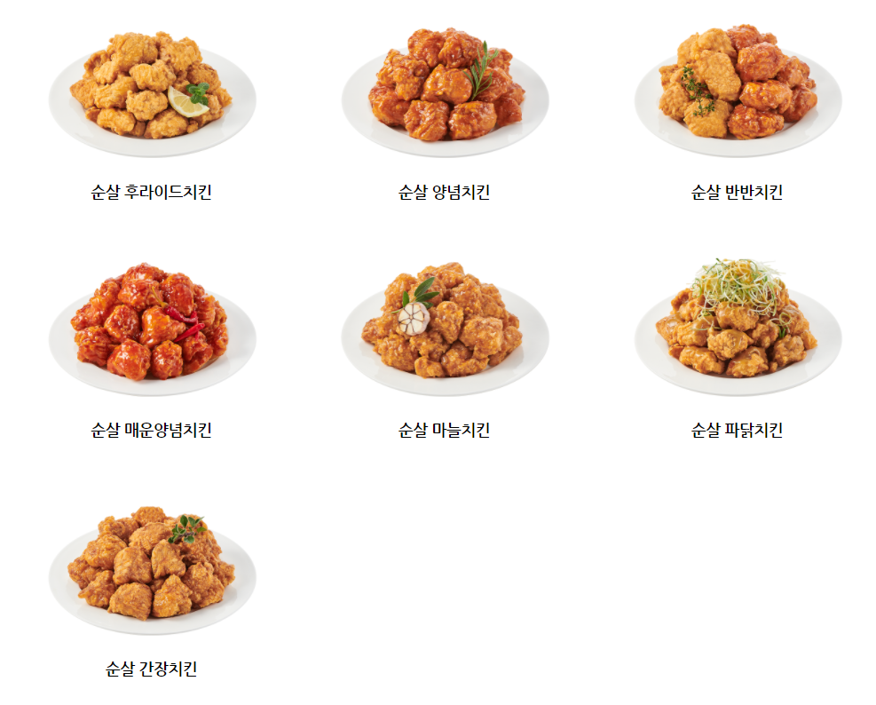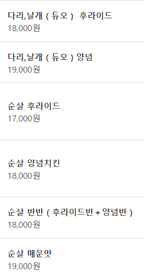 후라이드, 양념치킨, 매운양념치킨, 간장치킨, 칠리치킨의 경우는 순살, 신선 핀(닭다리), 신선 윙(닭날개)으로 주문이 가능합니다.