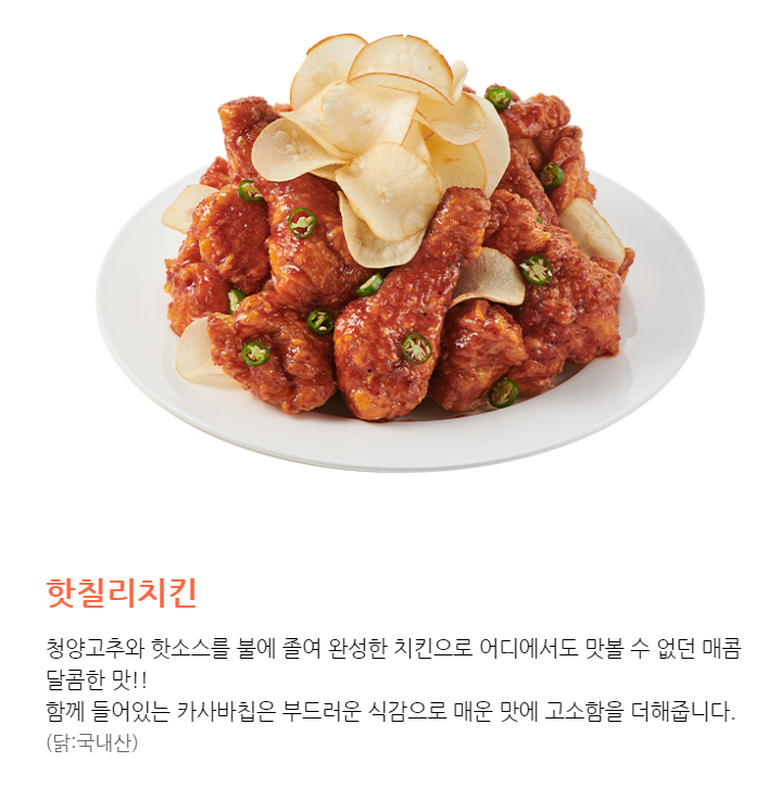 청양고추와 핫소스로 맛을 낸 치킨, 핫칠리치킨을 시키면 추가로 카사바칩을 주는 듯!