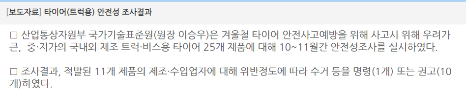 트럭·버스용 타이어 25개 제품에 대한 안전성 조사 결과 내구성 안전 기준을 위반한 1개 제품은 리콜 명령하고 KC인증을 취소했습니다.KC표시, 타이어 종류, 제조 연월 같은 법적 표시를 위반한 10개 제품은 개선조치를 권고했습니다.