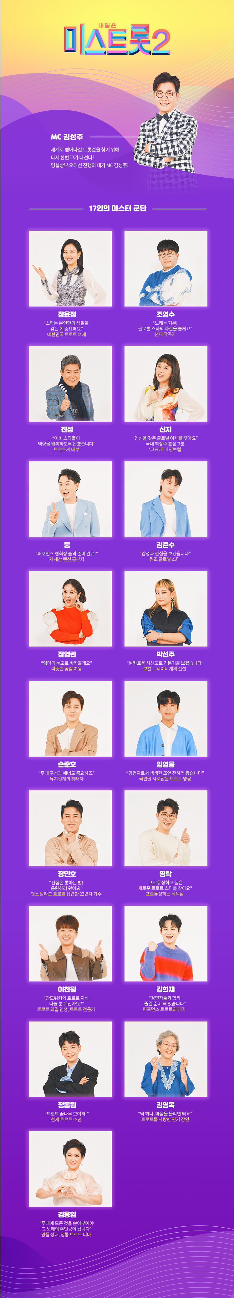 제작진은 “‘미스트롯1’과 ‘미스터트롯’ 등 시청자 여러분의 큰 사랑을 받았던 전작들을 통해 얻은 ‘원조의 노하우’를 아낌없이 쏟아부었다”고 전하며 “참가자도 마스터도 ‘올 업그레이드’를 이룬, 더욱 강력하고 화려해진 ‘미스트롯2’를 기대해 달라”고 말했습니다.