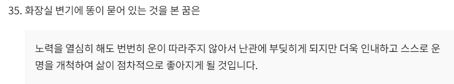 예를들어 화장실 변기에 똥이 묻어 있는 것을 본 꿈은 노력을 열심히 해도 번번히 운이 따라주지 않아서 난관에 부딧히게 되지만 더욱 인내하고 스스로 운명을 개척하여 삶이 점차적으로 좋아지게 될 것입니다.