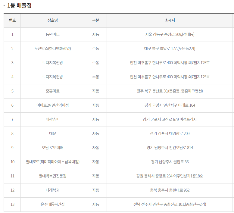 한편 인천 미추홀구 노다지복권방(인천 미추홀구 한나루로 400 학익시장 외7필지125호)에서 2명의 수동 당첨자가 동시에 나왔습니다. 이런 경우 한 사람이 두 장 동시 당첨 가능성도 있습니다.