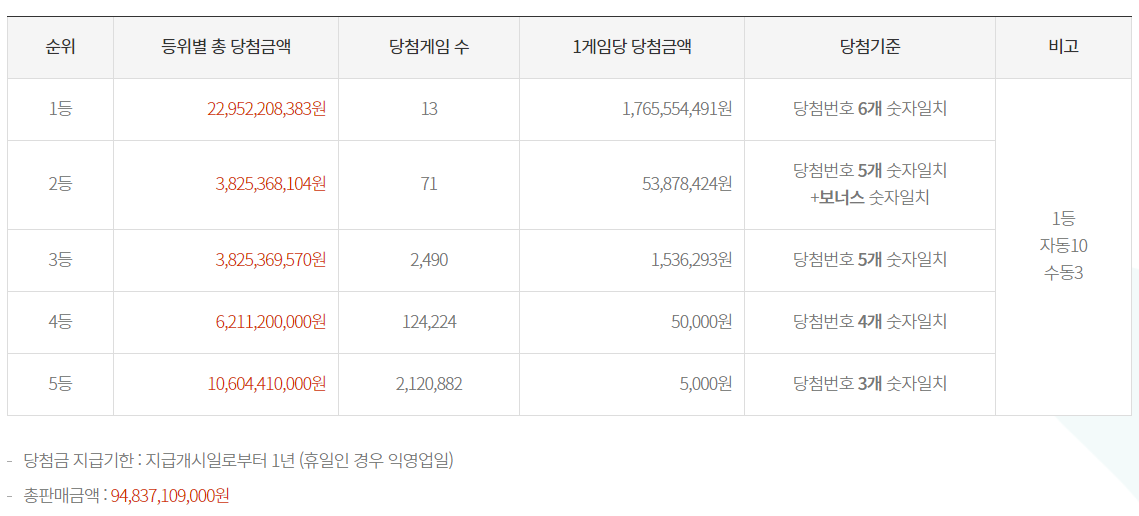 이번 1등 당첨자 패턴은 자동 10명, 수동 3명입니다.