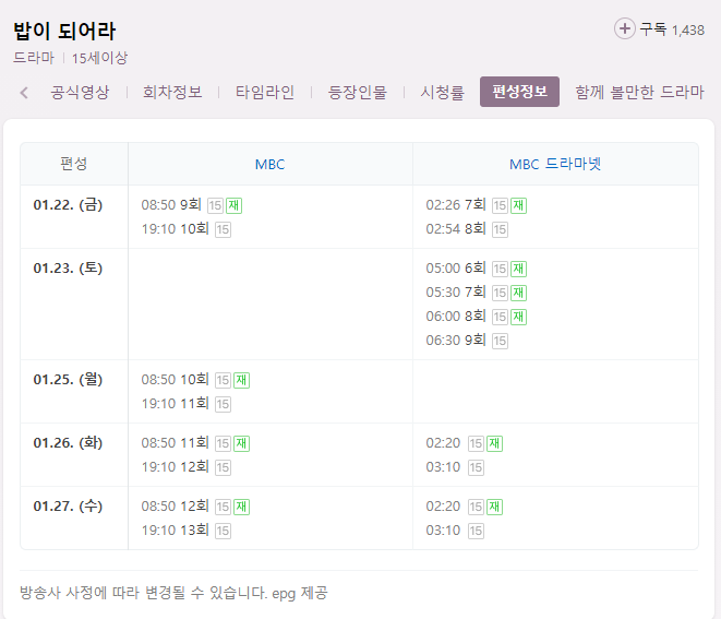 밥이 되어라는 포털사이트에서 '밥이 되어라' 재방송으로 검색하시면 편성정보를 확인하실 수 있습니다.