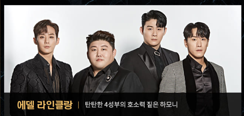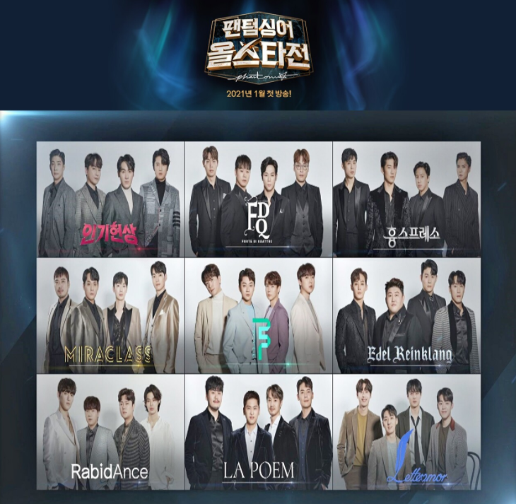 '팬텀싱어' 역대 시리즈를 통해 탄생한 남성 4중창 그룹 포르테 디 콰트로, 인기현상, 흉스프레소, 포레스텔라, 미라클라스, 에델 라인클랑, 라포엠, 라비던스, 레떼아모르가 출연합니다.