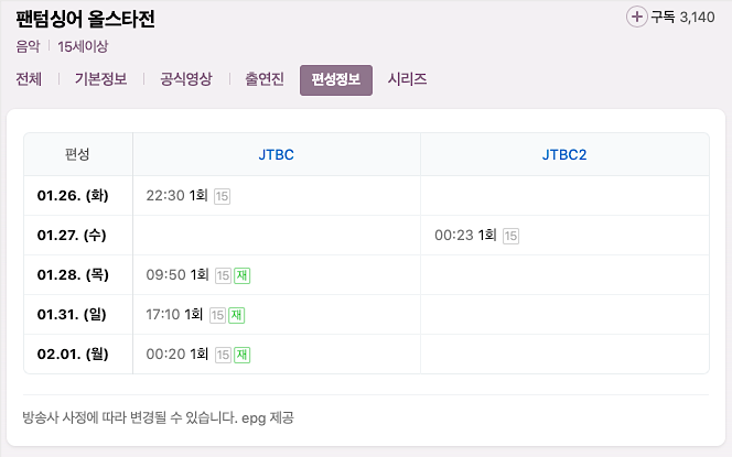 팬텀싱어 올스타전 재방송 시간은 확인하시기 위해서는 포털사이트에 팬텀싱어 편성표를 검색하시면 됩니다. 편성표는 아래 첨부드리도록 하겠습니다. 편성에 따라서 일부 달라질 수도 있지만, 통상 JTBC에서 목요일 오전 9시 50분, 일요일 17시 10분, 월요일 밤 0시 20분에 방영됩니다.