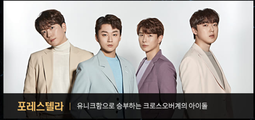 크로스오버 남성4중창 보컬그룹. 팀명 포레스텔라(Forestella)는 숲을 의미하는 영어 forest와 별을 의미하는 이태리어 stella를 합쳐 만든 것으로, "숲처럼 편안하고 별처럼 빛나는" 음악을 하고자 하는 각오를 담았습니다. 여기서 착안하여 남성팬은 숲, 여성팬은 별로 칭하기도 하며, 합쳐서 숲별이라는 애칭으로 부릅니다.