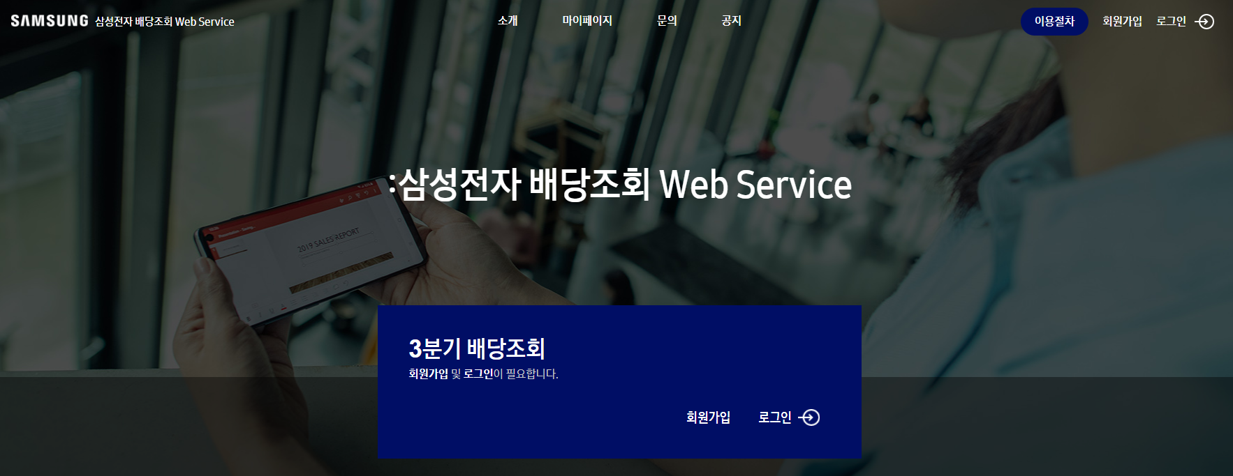 3분기 배당조회 회원가입 및 로그인이 필요합니다. 회원가입 로그인 삼성전자 배당조회 Web Service란? 배당기준일에 삼성전자 주식을 보유하신 주주분들이 배당내역을 확인하실 수 있는 Web Service