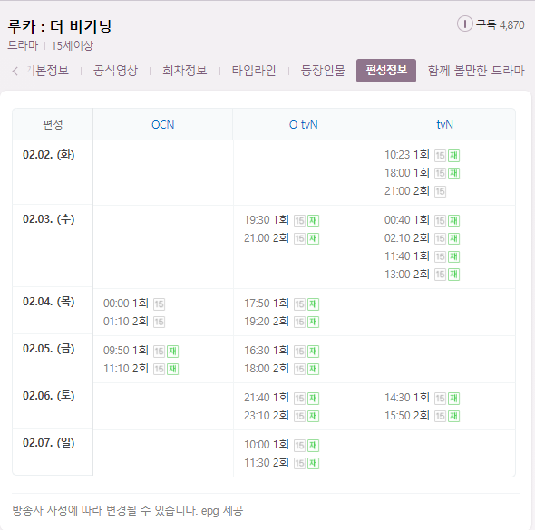 루카 더 비기닝 방송시간은 매주 월,화요일 오후 21시 tvN 채널에서 본방송 됩니다. 그리고 루카 더 비기닝 재방송 편성을 살펴보면 1회는 2일 오전 10시 40분, 오후 18시 10분에 재방 예정이 있으며 루카 더 비기닝 2회 재방 편성은 3일 새벽 1시 50분, 오후 13시 편성이 잡혀 있습니다.