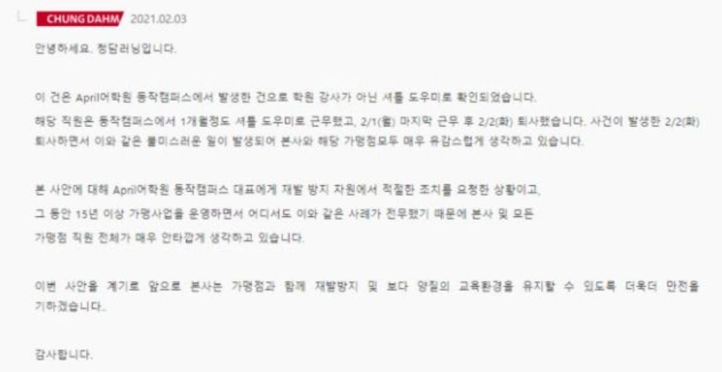 3일 청담러닝은 공식홈페이지를 통해 "해당 직원은 에이프릴어학원 동작캠퍼스에서도 1개월정도 셔틀 도우미로 근무했고 2월 1일 마지막 근무 후 사건이 발생한 2일 퇴사했습니다. 불미스러운 일이 발생되어 본사와 해당 가맹점 모두 매우 유감스럽게 생각하고 있다"라고 밝혔습니다.