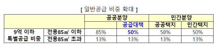 현재 공공분양은 일반공급분이 15%에 불과하므로, 당초 민간 택지인 점을 감안하여 일반공급 비중을 상향(15→50%)합니다.