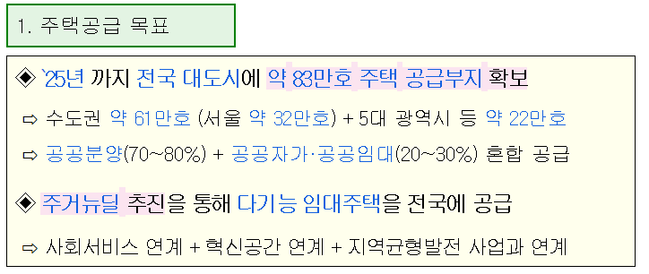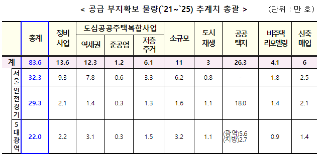 금번 대책을 통해 ‘25년까지 수도권 약 61.6만 호(서울 약 32만 호) 및 지방 약 22만 호 등 “총 83.6만 호 신규 부지”를 확보할 계획입니다.