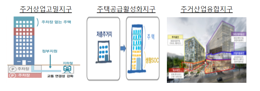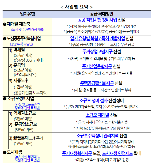 “도심 공공주택 복합사업(3년 한시)”을 신규 도입하여 노후‧슬럼화, 비효율적 부지 이용 등에도 불구하고 적정 개발수단이 없어 방치 중인 역세권‧준공업지‧저층주거지 등을 신속 정비합니다.