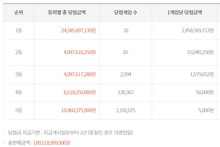 당첨금 지급기한은 지급 개시일로부터 1년 이내이며, 당첨금 지급 마지막 날이 휴일이면 다음 영업일까지 받을 수 있습니다.