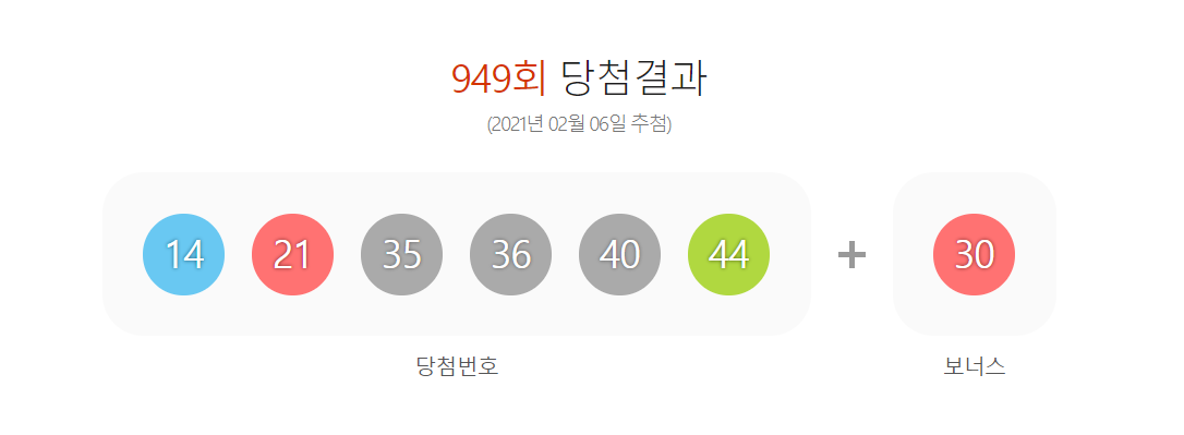 로또복권 운영사 동행복권은 제949회 로또복권 추첨에서 '14, 21, 35, 36, 40, 44'가 1등 당첨번호로 뽑혔습니다.