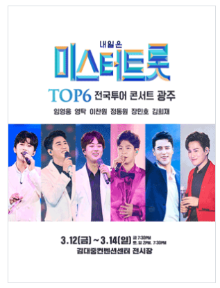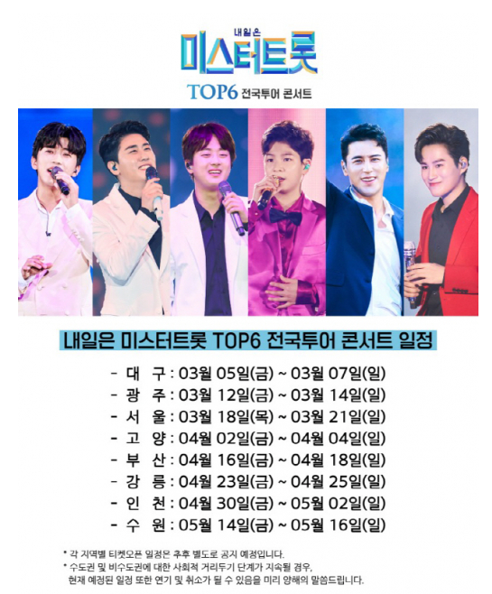 ‘2021년 내일은 미스터트롯 TOP6 전국투어 콘서트’ 일정을 살펴보면 3월 5일~7일 대구를 시작으로 광주 3월 12일~14일, 서울 03월 18일~21일, 고양 4월 2일~4일, 부산 4월 16일~18일, 강릉 4월 23일~25일, 인천 4월 30일~5월 2일, 수원 5월 14일~16일이다. 다만 코로나19 상황에 따라 기간 및 지역이 재연기·취소가 될 수 있습니다.