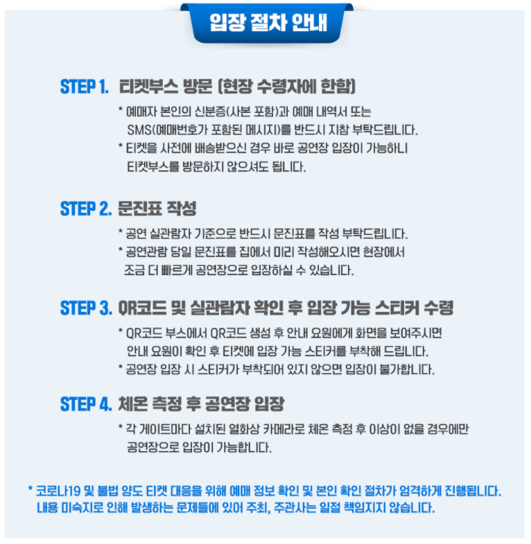 입장절차는 티켓부스를 방문하여 문진표를 작성하고 QR체크인 및 발열체크 후 입장이 가능합니다. 쇼플레이는 “정부와 질병관리청에서 권고하는 코로나19 방역지침을 준수하여 관객, 아티스트, 스태프 모두가 안전한 환경에서 공연을 관람, 진행할 수 있도록 최선을 다하겠다”며 “이제까지 기다려 주신 많은 관객분들을 위하여 최상의 공연으로 보답할 수 있도록 노력하겠다”고 덧붙였습니다.