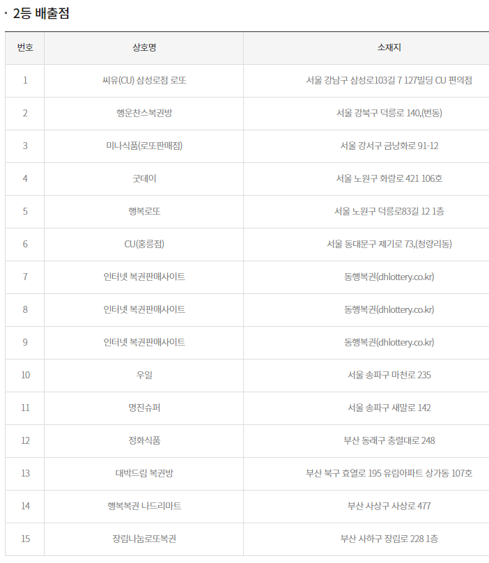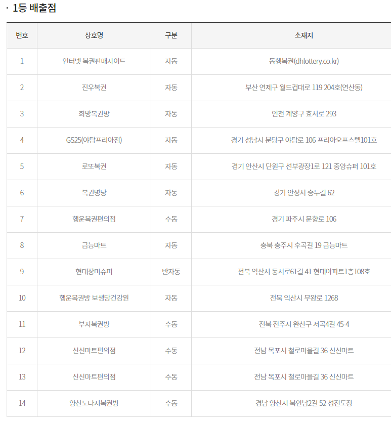 특히 이번 회차에서는 인터넷 복권판매사이트에서 1게임이 배출됐으며, 전남 목포의 한 판매점에서 2개 게임이 당첨돼 눈길을 끌었습니다.