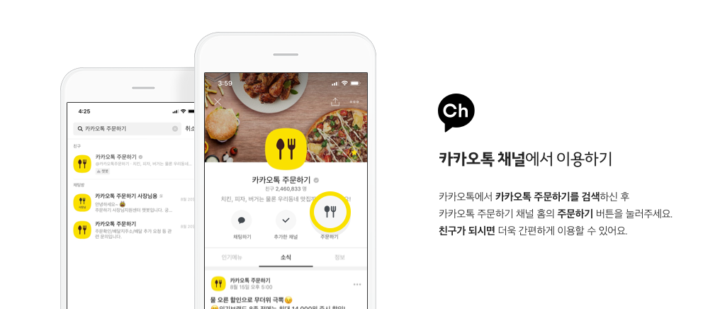 카카오톡에서 카카오톡 주문하기를 검색하신 후 카카오톡 주문하기 채널 홈의 주문하기 버튼을 눌러주세요.