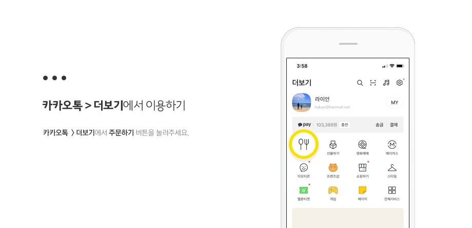 방법2. 카카오톡 더보기를 이용하여 주문하기 버튼을 누룹니다.