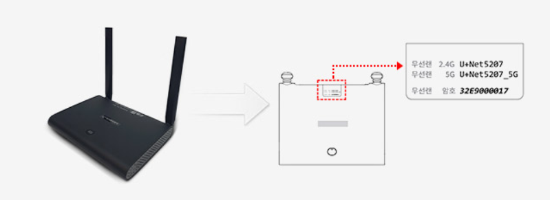 무선랜 이름과 비밀번호는 단말기에 붙여진 스티커에서 확인 할 수 있습니다.