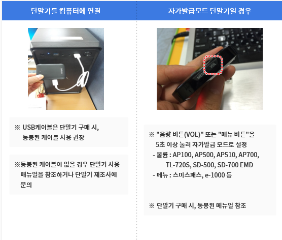 설치 확인까지 되었으면 이제 컴퓨터에 단말기를 연결하고 아래와 같은 화면이 나오면 '단말기 연결 확인' 버튼을 클릭합니다.