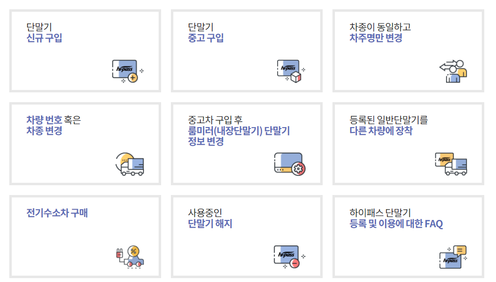 아래 링크로 이동하시면 하이패스 단말기 구입, 등록, 변경, 해지 등 이용방법을 안내받을 수 있습니다.
