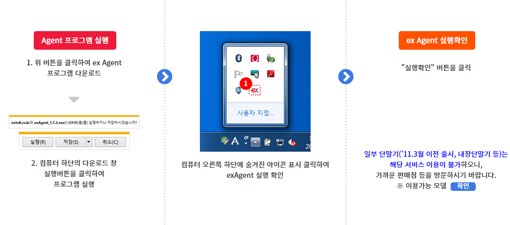 아래 사진의 표시한 부분을 참고하여 단말기 등록에 필요한 에이전트(프로그램)를 설치한 후(왼쪽 화면), 설치가 잘 되었는지 확인합니다. 그리고 하이패스 홈페이지에 있는 'ex Agent 실행확인' 버튼을 클릭하여 확인합니다.