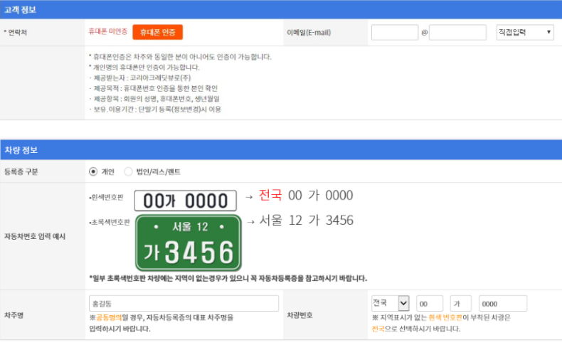 화면에 있는 고객 정보와, 차량 정보를 모두 입력하고, 약관을 확인한 후 단말기 등록을 완료합니다.