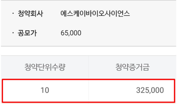 4. 최소 주수 10주를 선택하면 청약증거금 325,000원을 확인 하실 수 있습니다.