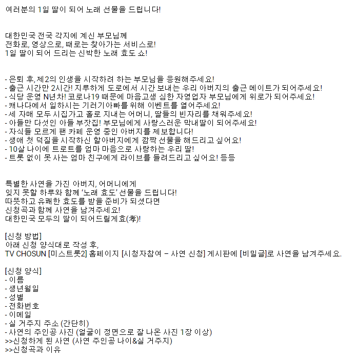 아래 신청 양식대로 작성 후,TV CHOSUN [미스트롯2] 홈페이지 [시청자참여 – 사연 신청] 게시판에 [비밀글]로 사연을 남겨주시면 됩니다.